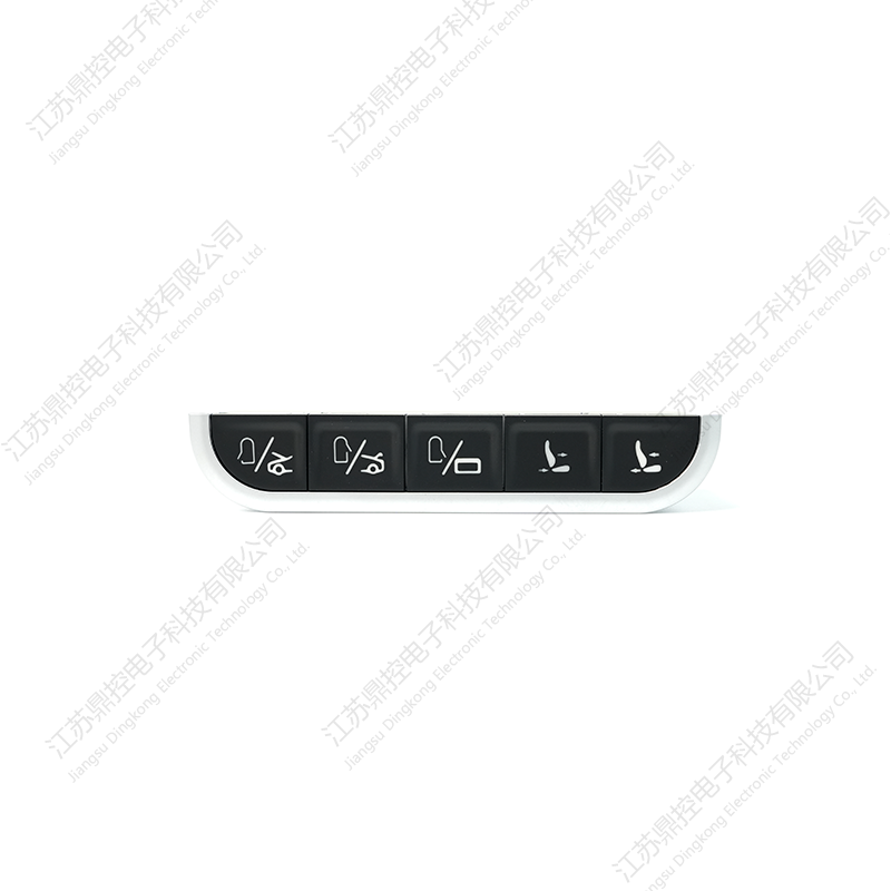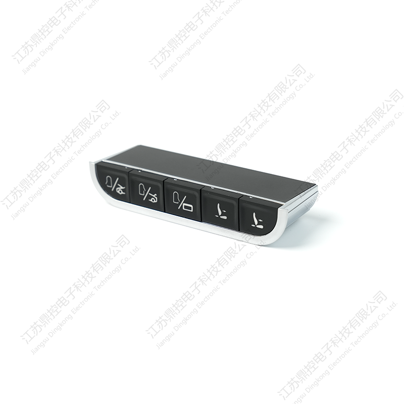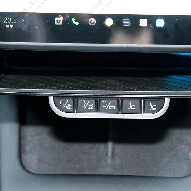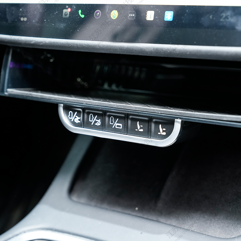 Fem taktila metallknappar är snyggt arrangerade under brickan, vilket ger intuitiv tillgång till viktiga fordonsfunktioner. Varje knapp svarar med ett skarpt haptiskt klick, vilket ger användarna en solid känsla av kontroll. Funktionerna inkluderar öppning och stängning av framdörrarna, de främre och bakre trunkarna och kontroll av laddningsportkåpan - allt är omedelbart tillgängligt till hands.